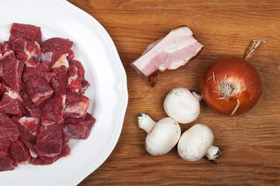 Popečemo slanino in ko je pečena, jo damo v kozico, v kateri bomo kuhali ostale sestavine. Govedino narežemo na enake kose in jo dobro osušimo. Vlažno meso ne bo porjavelo. V ponvi rahlo popečemo govedino in jo nato stresemo v isto kozico kot slanino. Meso in slanino solimo in popramo ter potresemo z moko. Odprto kozico damo v pečico za 4 minute. Po štirih minutah ponovno premešamo in še enkrat damo v pečico za dodatne 4 minute. Nato posodo vzamemo iz pečice in temperaturo zmanjšamo na 165ºC. V posodo zlijemo dva 2dl goveje jušne osnove in 2 dl rdečega vina. Posodo pokrijemo in jo damo v pečico za 4-6 ur.
