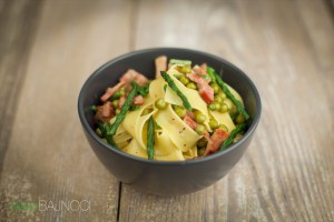 Ko so testenine kuhane, prihranimo eno zajemalko vode od kuhanja. Na testenine damo slanino, šparglje in grah. Zalijemo z jajcem in na hitro pomešamo. Če je omaka presuha, dodamo vodo, ki smo jo prihranili. Naribamo parmezan in še enkrat premešamo. Če je potrebno dosolimo in še malo popopramo.