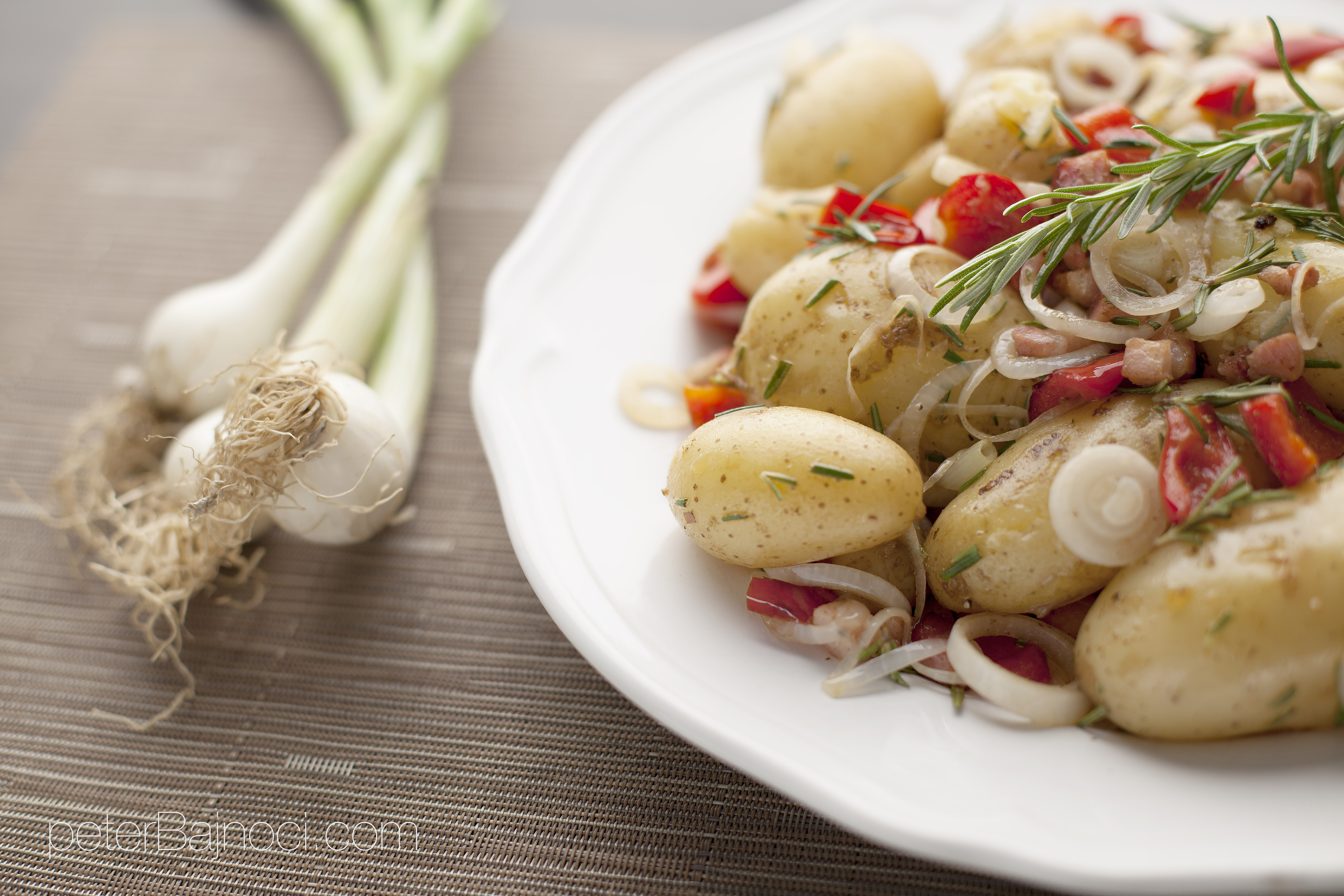 Kot že naslov pove, je tokratni recept solata iz mladega krompirja, ki vsebuje same dobre sestavine: popečeno slanino, popečeno rdečo papriko, surovo mlado čebulo in rožmarin.