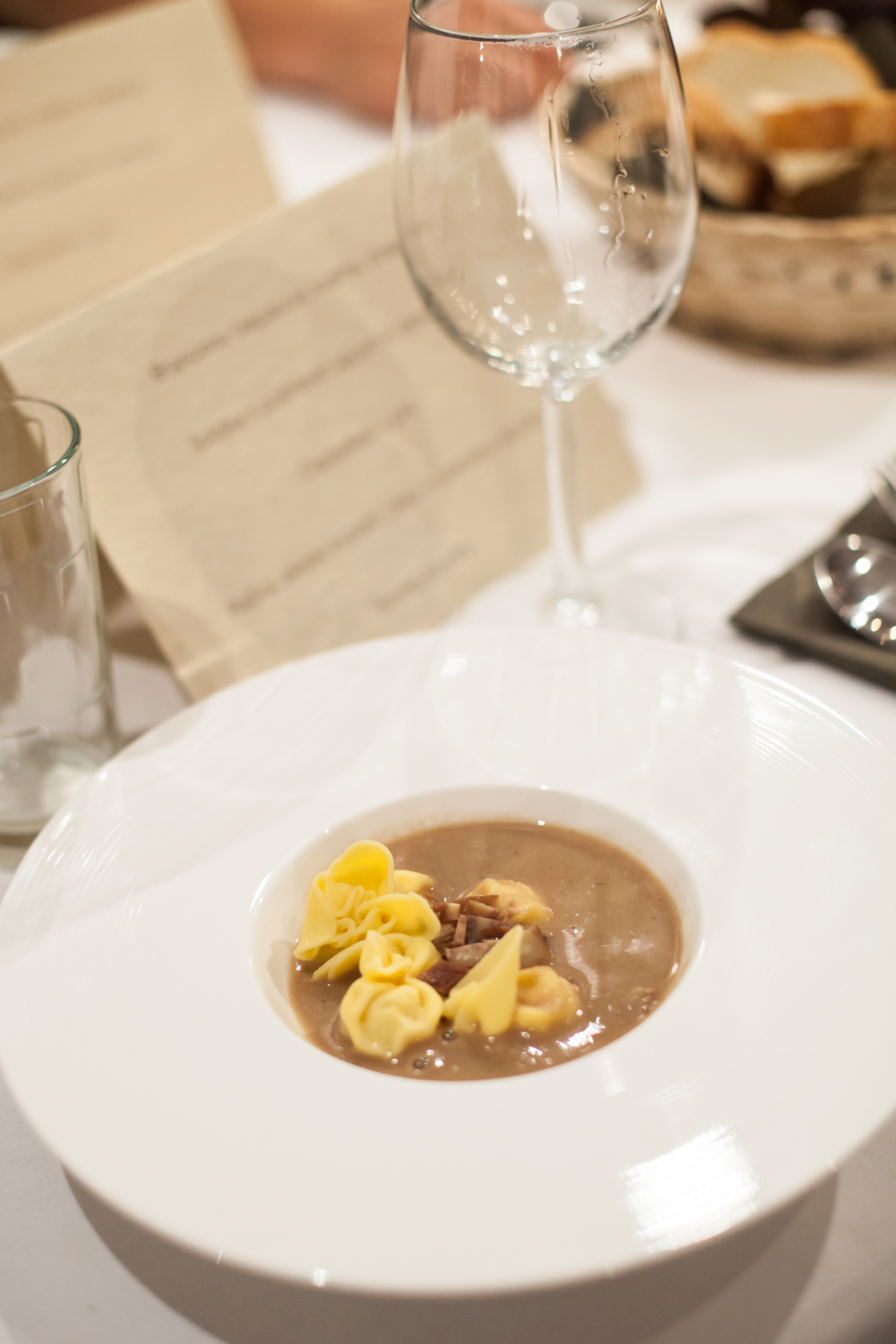 (na fotografiji je juha postrežena z žepki, polnjenimi s hruško)