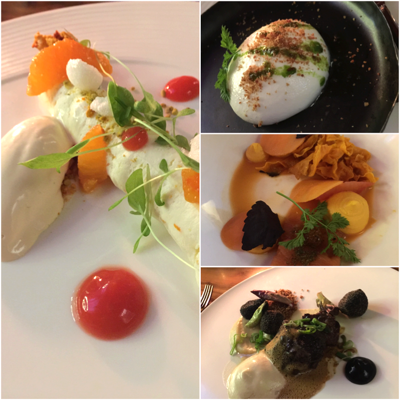 – Rdeča pomaranča, gel rdeče pomaranče, jogurtov mousse, mlečna pena, sladoled iz zažganega medu, medeno satje, cvetni prah
