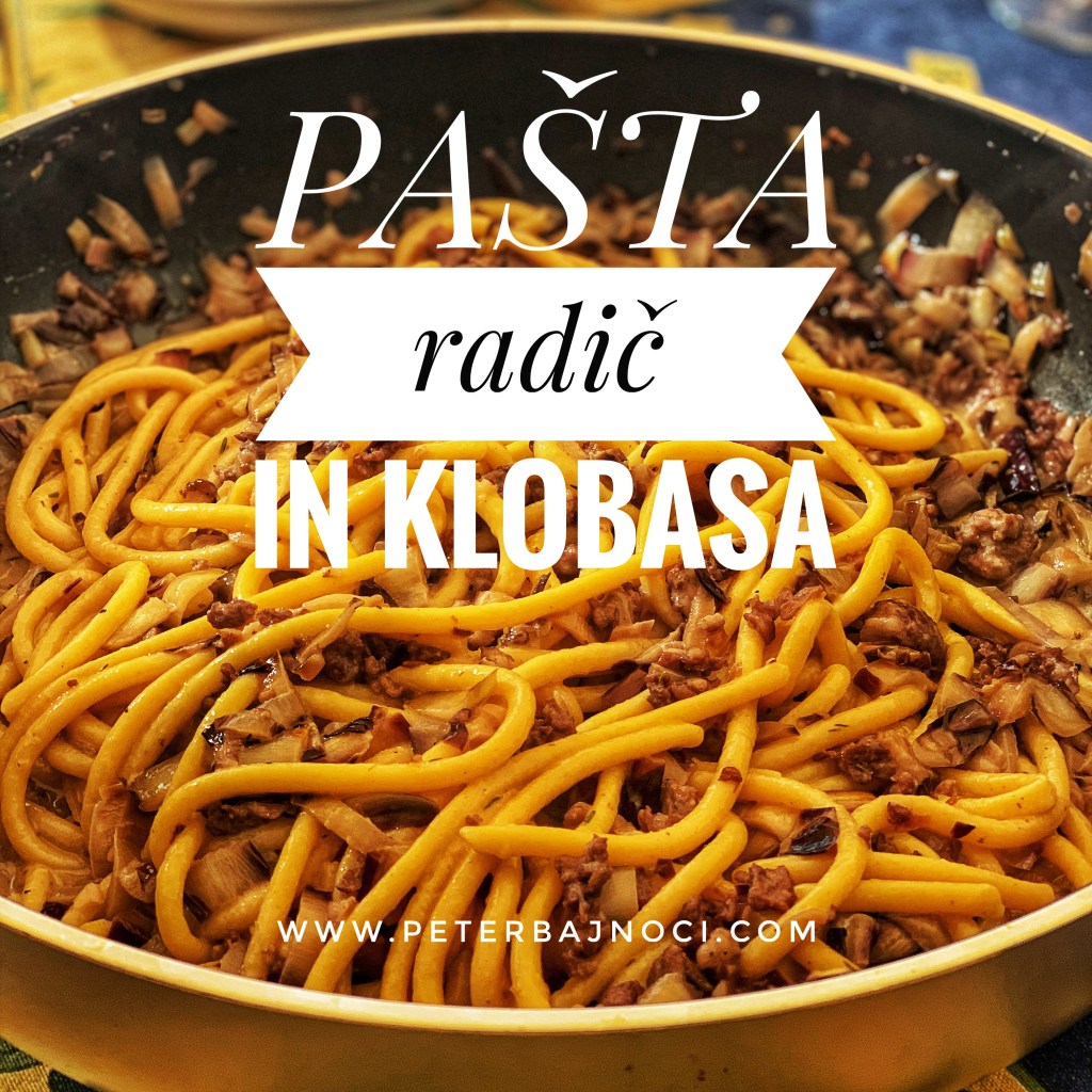 Klobasi odstranite ovoj in meso na maslu popražimo do čudovito zlato-rjave barve. Solimo, popramo in zalijemo z rdečim vinom ter pokuhamo, da alkohol izhlapi. Dodamo narezan radič in vse skupaj toplotno obdelujemo, dokler ni radič nekoliko uvel, vendar mora še vedno lepo izgledati. Nisem sicer gledal na čas, ampak bi rekel, da sem radič v ponvi kuhal kakih 5 minut.