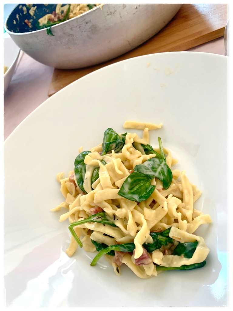 Tokrat sem klasični carbonari dodal svežo špinačo, ki doda malo barve, rahlo grenak okus in seveda vse koristne sestavine, ki jih špinača vsebuje.