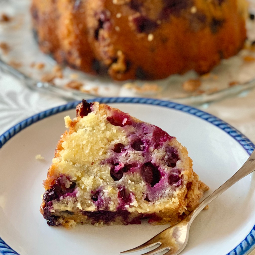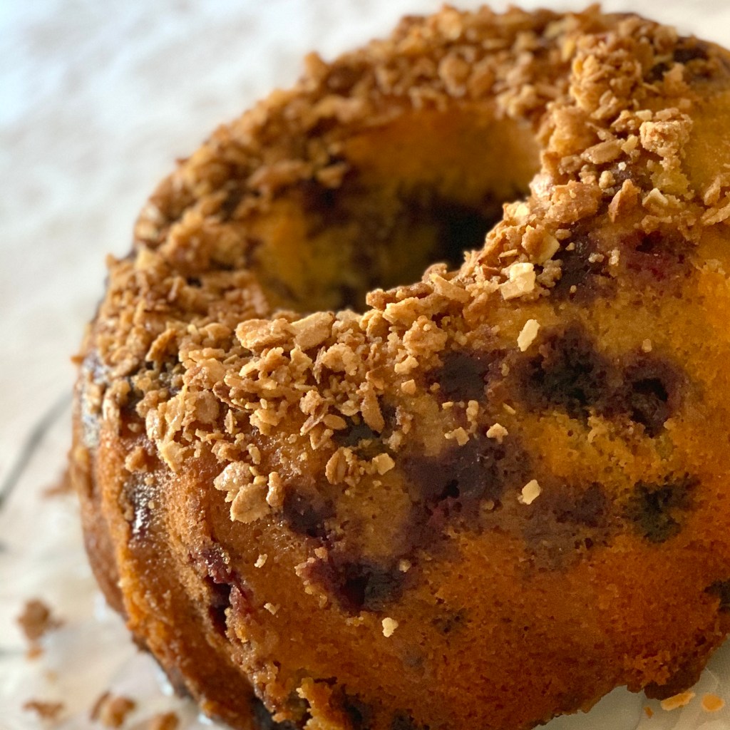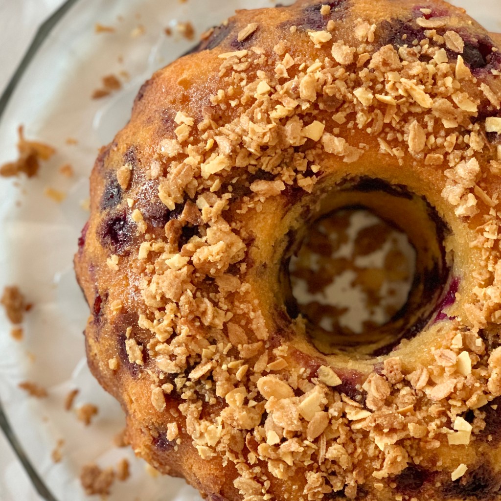 Sestavini za glazuro zmešamo in prelijemo kolač ter potresemo s cramblom.