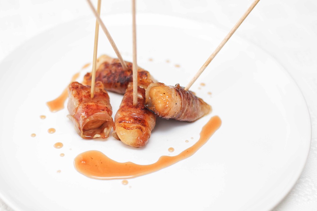 Vsak krhelj zavijemo v dve rezini pancete in pazimo, da se panceta po sredini nekoliko prekriva.