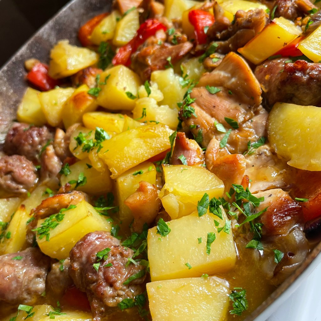 Piščanca in klobase narežemo na srednje velike kose in jih na oljčnem olju popečemo, da dobijo zlato-rjavo barvo. Meso odstranimo iz ponve in v isti posodi popečemo še čebulo, papriko in česen (zelenjavo prav tako najprej narežemo na večje kose, česen narežemo na tanjke rezine).