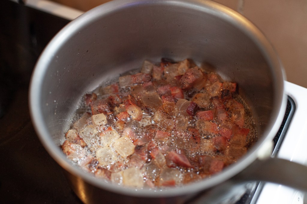Nato v hladno kozico dajte na srednje velike kose narezane ličnice in dajte kozico na ogenj. Pozor: kozica mora biti hladna in nikakor ne dodajajte maščobe, saj bodo ličnice precej maščobe spustile med peko! Na začetku je temperatura ognja lahko višja, ko pa se začne cvreti, zmanjšajte ogenj na minimum in pecite toliko časa, da so ličnice prijetno popečene. Med pečenjem dodajte v kozico ščepec soli.