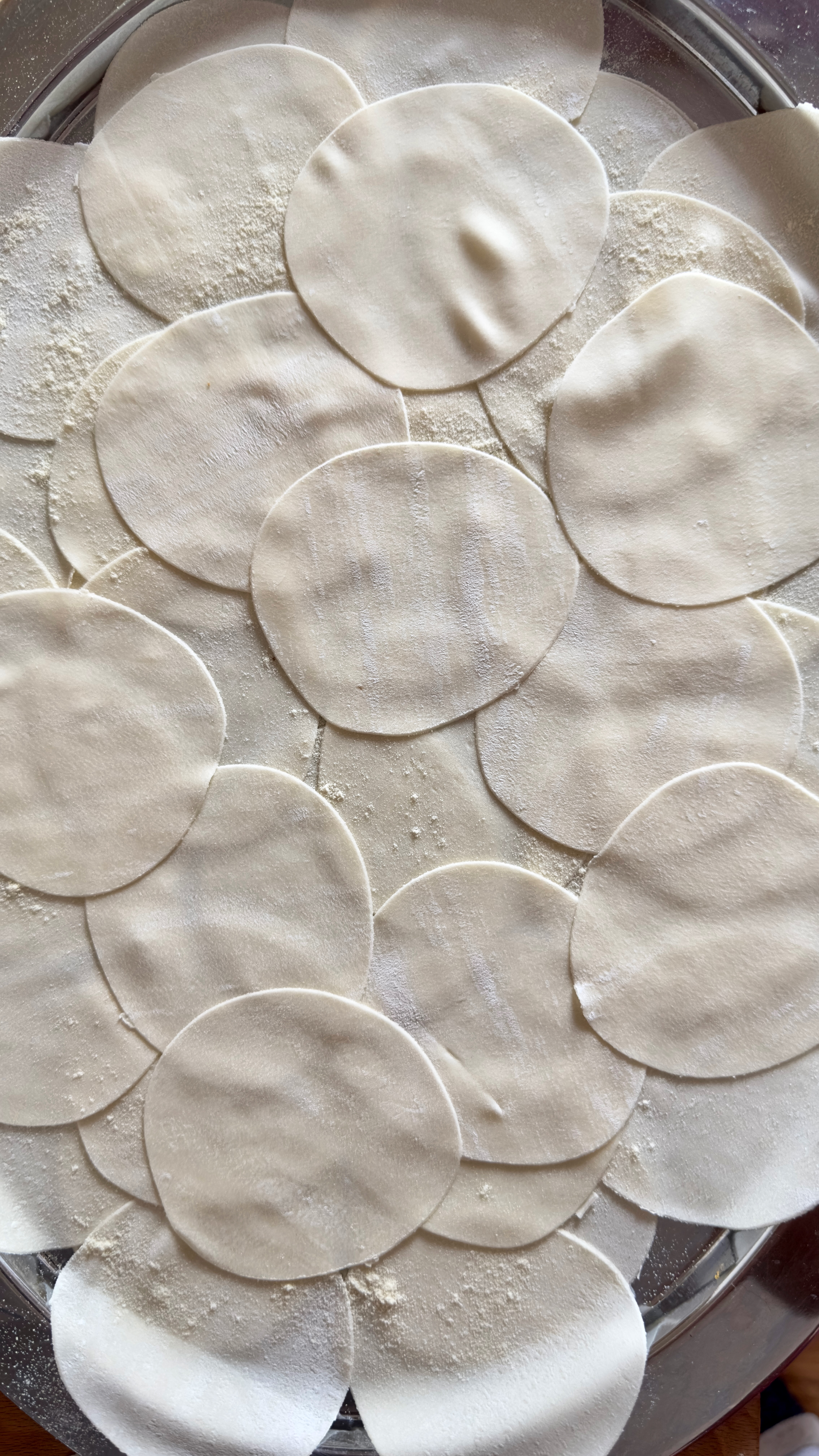 Vodo zavremo in ji primešamo sol. Nato vodo počasi vmešavamo v moko in gnetemo približno 10 minut, da dobimo gladko testo. Ovijemo v plastično folijo in pustimo počivati 30 minut. Testo nato razvaljamo. Jaz sem uporabil napravo za testenine, kar pomeni, da je bilo v mojem primeru testo razvaljano na debelino, ki ustreza številki 1. Med valjanjem uporabimo gustin ali riževo moko, da se nam testo ne prime na napravo za testenine oziroma podlago, na kateri delamo.