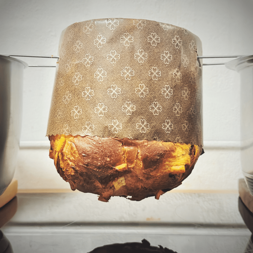 Panetton vzamemo iz pečice, ga prebodemo na spodnjem delu in obrnemo na glavo (kot kaže fotografija spodaj). Tako naj počaka vsaj 6 ur.
